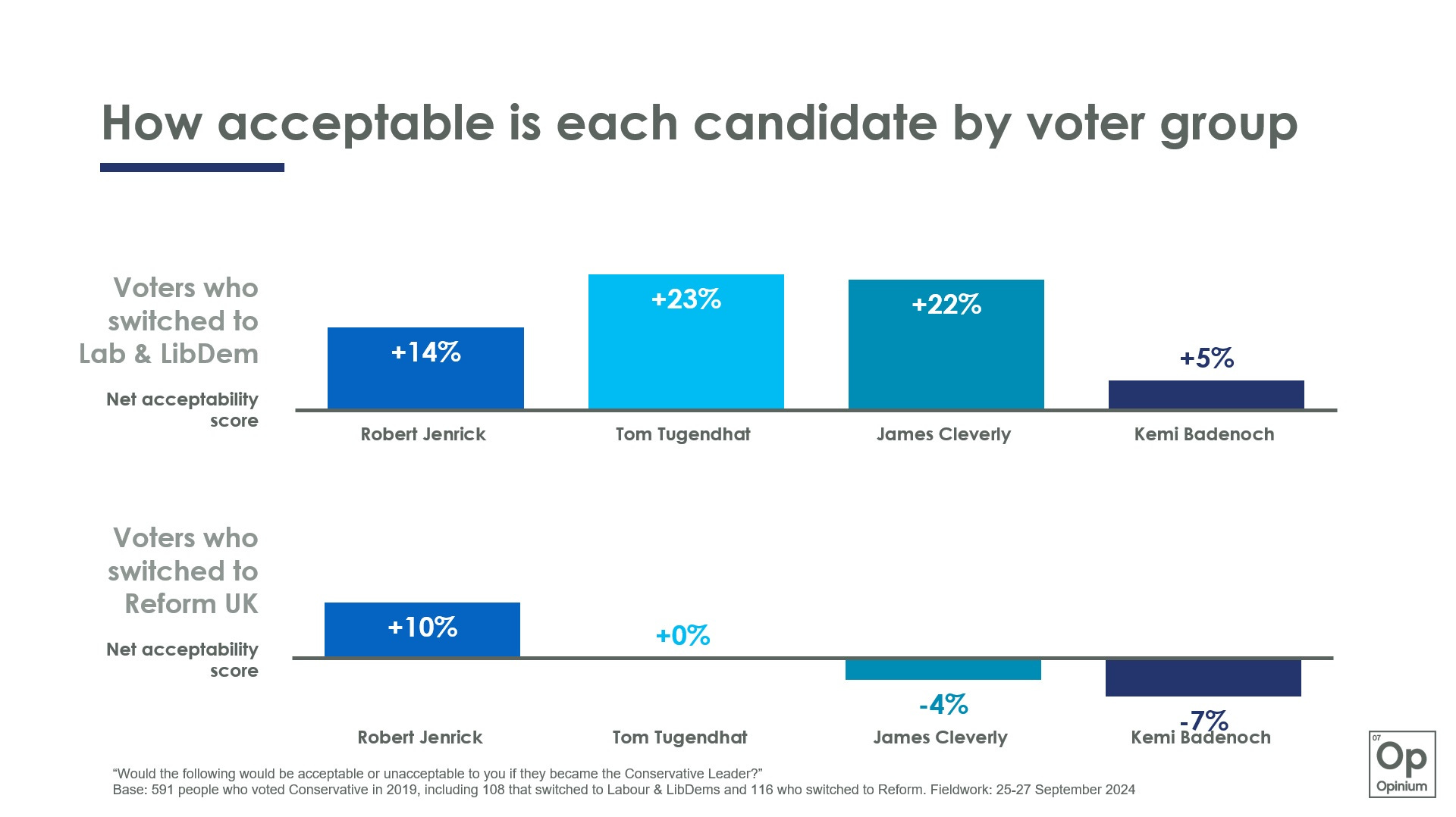 A somewhat surprising element here is Kemi Badenoch. She is often described as a candidate of the right, but having over a third of switchers to Reform think of her as unacceptable as leader seems a particular challenge. By comparison, for the candidates from the centrist wing, Tom Tugendhat benefits from having edged a slightly better net score (+0) amongst this group than James Cleverly.